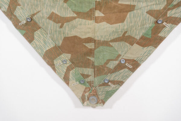 Zeltbahn, telo tenda/poncho individuale, mimetico Splittertarn reversibile con due cromie differenti di tono di colore. Usato, buono lo stato di conservazione, presenti qualche piccola riparazione d’epoca, vedi foto in dettaglio, colori brillanti.