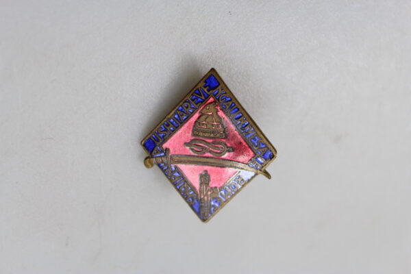 Pin smaltato della Campagna d’Albania. “SHQIPNIA USHTAREVE NGALLNJYESA TE ROME” (L’Albania ai soldati vittoriosi di Roma). Produttore Boeri – Roma. Usato, buono stato di conservazione.