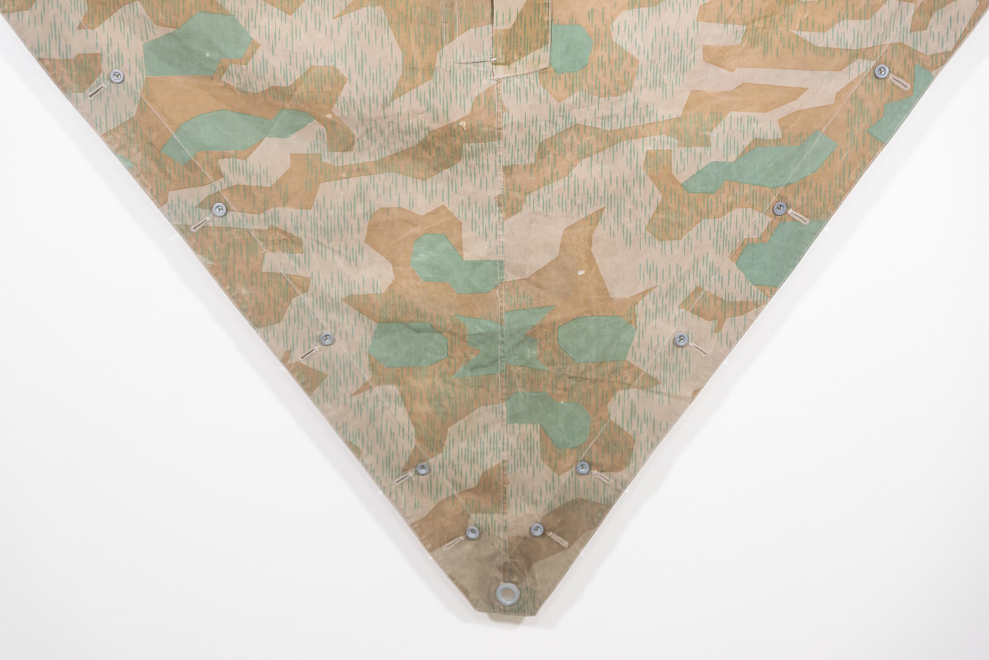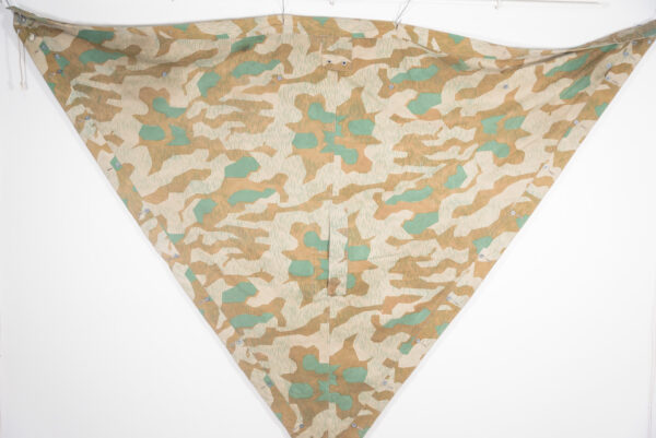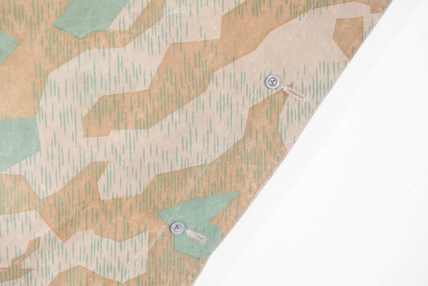 Zeltbahn, telo tenda/poncho individuale della Wehrmacht, mimetico Splittertarn reversibile con due cromie differenti di tono di colore. Non sono visibili marcature. Usato, buono lo stato di conservazione.