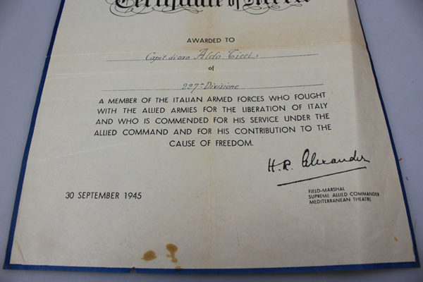 Certificato di Merito, rilasciato il 3 Settembre 1945, ad un Ufficiale del REI coobelligerante con l’Esercito del Sud. Buono stato di conservazione.