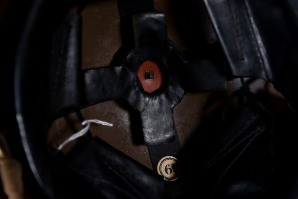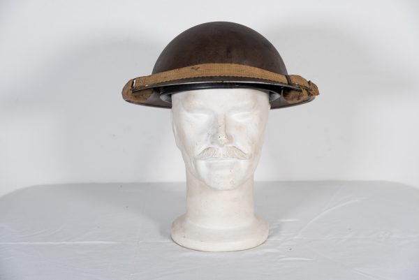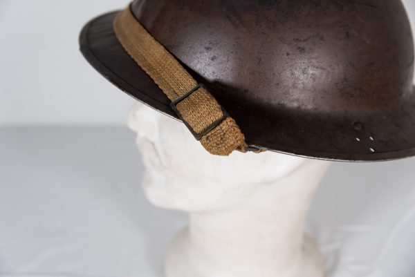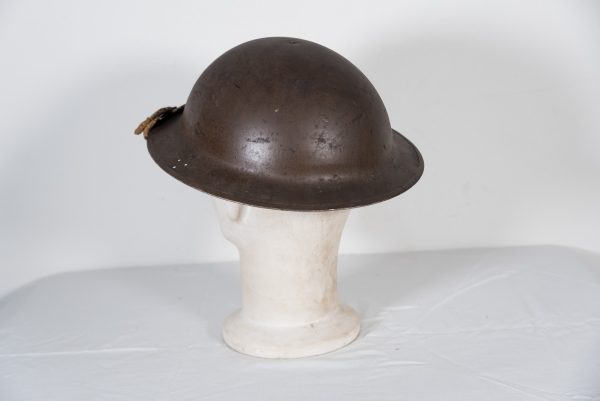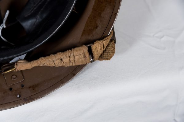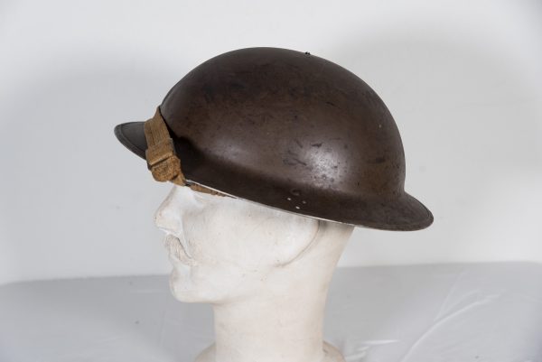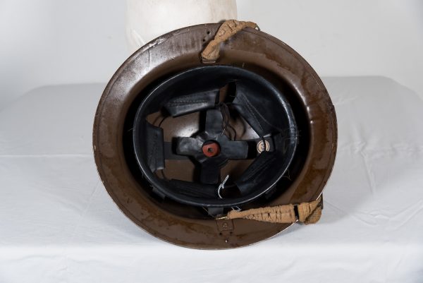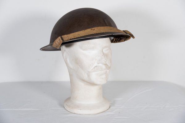 Elmetto Mk2 Inglese della Seconda Guerra Mondiale, destinato alle retrovie oppure alla Home Guard, segno identificativo tre fori su entrambi i lati della falda, che stavano a significare “difetti di costruzione” oppure metallo peggiore scarsamente balistico. Colorazione tipica marrone, completo di sottogola di primo tipo ,liner marcato 1944. Usato, buono stato di conservazione.