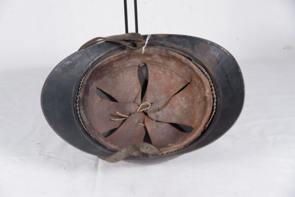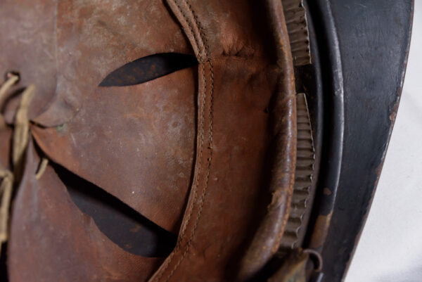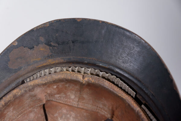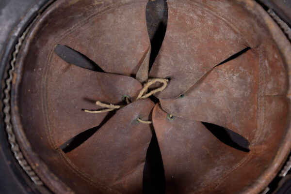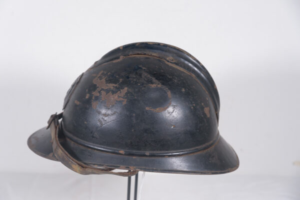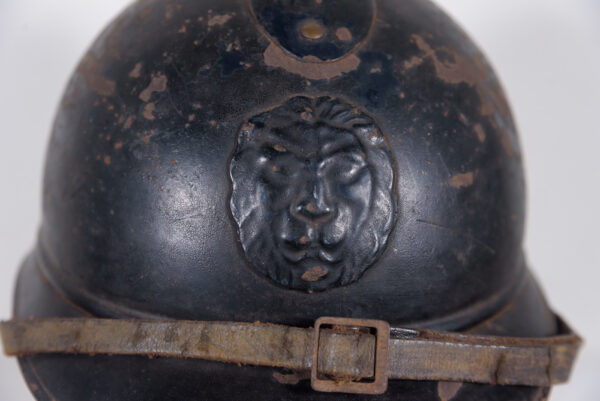 Adrian M.15 della Prima Guerra Mondiale, produzione Francese per il Belgio, in questo caso la sovracolorazione nera ci indica che si tratta di un elmetto utilizzato dalla Gendarmerie dal 1915 ai primi anni 20′. Completo di sottogola e cuffia in pelle della Prima Guerra Mondiale. Usato, buono stato di conservazione, bella patina.
