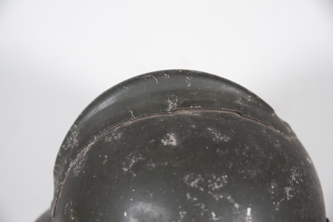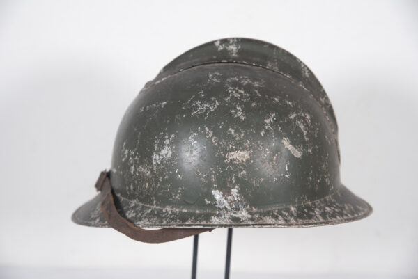Interessante elmetto Adrian M.16 degli anni 20’/30′, fatto in alluminio, prevalentemente per uso da parata, completo di fregio frontale dei Reparti Chimici, cuffia e sottogola, quest’ultimo con riparazione, vedi foto in dettaglio. Usato, contrariamente a come siamo abituati a vedere questo genere di elmetti, comunque in buono stato generale di condizioni e in bella patina.