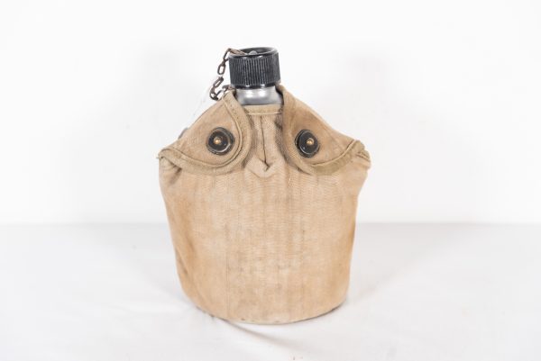 Borraccia US Army della Seconda Guerra Mondiale, completa di cover e gavettino. Borraccia e gavettino marcati con produttore e datati 1945. Usata, buono stato di conservazione.