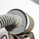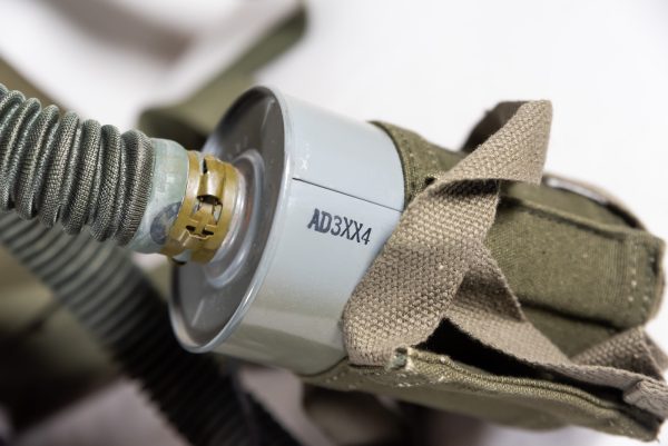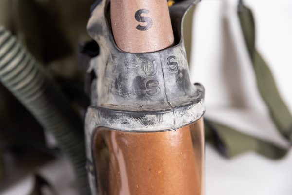 Maschera antigas M.24 aircraft, usata in Korea e Vietnam, dapprima destinata all’USAF e inseguito data anche alle truppe a terra, completa di lente di ricambio e altri accessori, oltre alla sacca tracolla. Mai stata usata, fondo di magazzino. La patina bianca sul facciale in gomma, è un protettivo che viene via con l’ausilio di un panno inumidito con acqua.