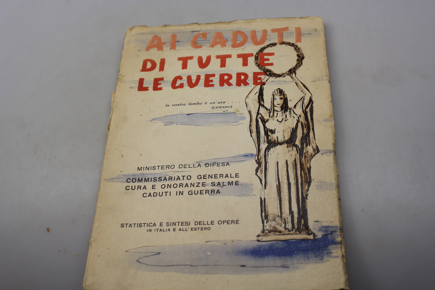“Ai Caduti di tutte le guerre” . Libro illustrato a cura del Ministero della Difesa del 1950, sui Caduti di tutti gli eserciti belligeranti, sepolti in cimiteri e sacrari sul suolo Italiano, di entrambe le due Guerre Mondiali. Usato, buono stato di conservazione.
