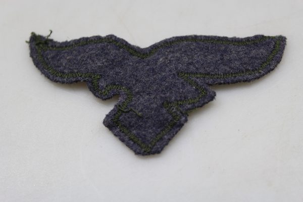 Interessante aquila da petto della Luftwaffe, ricamata su base drillich spigato verde, con sottopannatura di fabbrica, fatta in panno leggero in colorazione blaugrau. Usata, tolta da giacca, buono stato di conservazione.