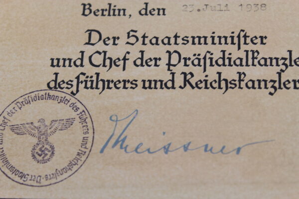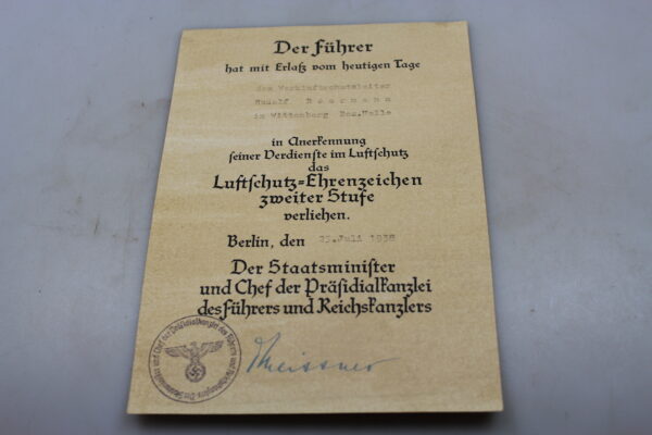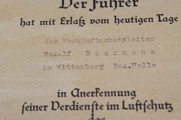 Attestato per medaglia Luftschutz Ehrenzeichen 2^ Classe, assegnata ad un Capo Area della Luftschutz che prestava servizio in una fabbrica. Buono stato di conservazione.