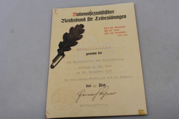 Attestato con premio in bronzo dato al terzo classificato in una gara di Pentathlon, assegnato durante lo svolgimento del Wettkampf del 1941 di Simbach am Inn. Buono stato di conservazione.