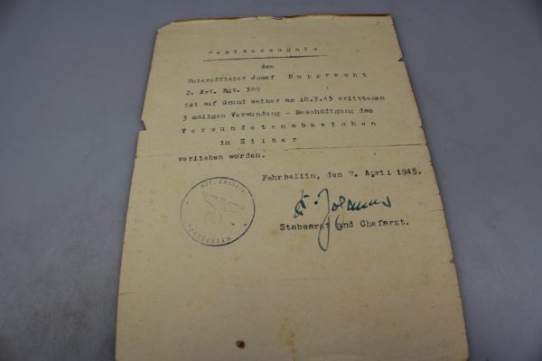 Coppia di attestati per Ferita di Seconda e Terza Classe, ricevuti entrambi da un Artigliere il primo nel 1942, quello in “silver”,versione da “campo”,poco prima la fine della guerra, nel 1945 inoltrato. Usati in buono stato di conservazione.