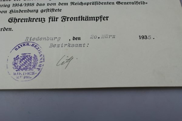 Interessate attestato per Frontkampfer, rilasciato nel 1935 ad un Insegnante Senior. Buono stato di conservazione.