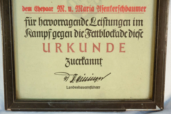Urkunde dato ad un allevatore di mucche, premiato per una buona produzione di latte nel 1942. Conservato in cornice d’epoca, fatta in legno. Dimensioni cm 32×22. Buono stato di conservazione.