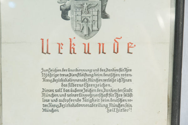 Urkunde, messo in cornice di legno, dato per i 25 anni di Fedele Servizio con emblema della città di Munchen. Dimensioni cm43x32. Buono stato di conservazione.