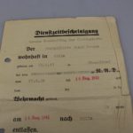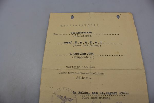 Attestato di conferimento per Infanterie Sturmabzeichen in silver con altro attestato di servizio dall’Agosto del 1939 all’Agosto del 1942, rilasciati ad un Obergefreiter di un Reggimento di Fanteria. Buono stato di conservazione.