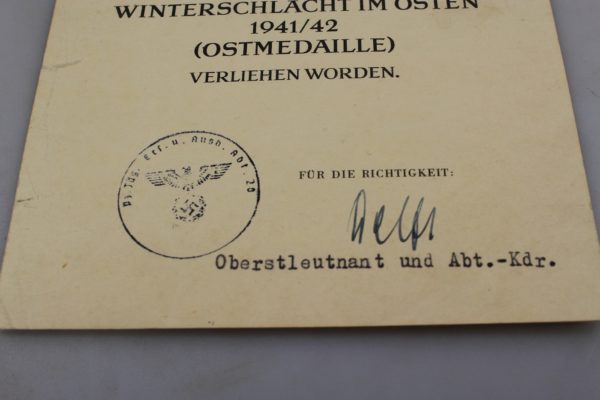 Attestato per Ostmedaille, rilasciato nel Luglio del 1942 ad un Ufficiale. Buono stato di conservazione.
