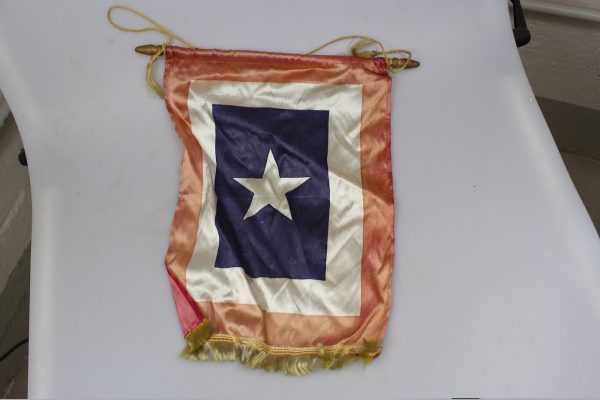 Gagliardetto in raso, dimensioni cm 27×21, periodo Seconda Guerra Mondiale, che veniva attaccato ad una finestra delle abitazioni Americane, da parte delle famiglie che avevano un congiunto impegnato al fronte. Buono stato di conservazione.