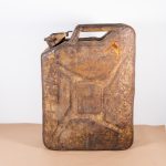 Tanica per carburante Inglese della Seconda Guerra Mondiale, colorazione giallo Africa/Sud Front, con data, produttore e broad-arrow. Usata, presente ancora vernice gialla, eventualmente da ripulire.