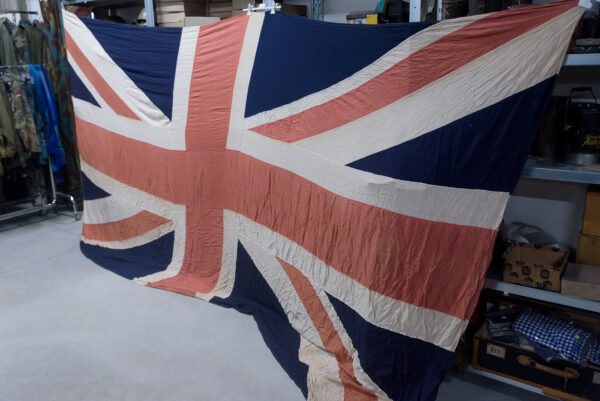 Bandiera Union Jack Inglese, per costruzione e materiale impiegato, databile dagli anni 30′ agli anni 50′, difficile stabilire con esattezza la data. Il materiale impiegato è un filato di misto lana/cotone ritorto, la costruzione della bandiera è tutta cucita pezzo per pezzo e non stampata. Dimensioni Mt.4,40 x 2,20. Usata, buono stato di conservazione, bella patina.