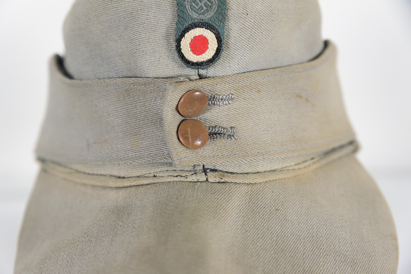 Bergmutze truppa Gebirgsjager della Wehrmacht, di produzione privata databile 1942/43, fatto in gabardina, panno “doppia faccia”, fornitura o preda bellica Italiana, completo di fregio a T Be-Vo a “bassa visibilità”, sulla parte sinistra accanto all’edelweiss presente un badge e accanto il segno lasciato da un’altro. Usato e sbiadito, ancora in buono stato di conservazione.