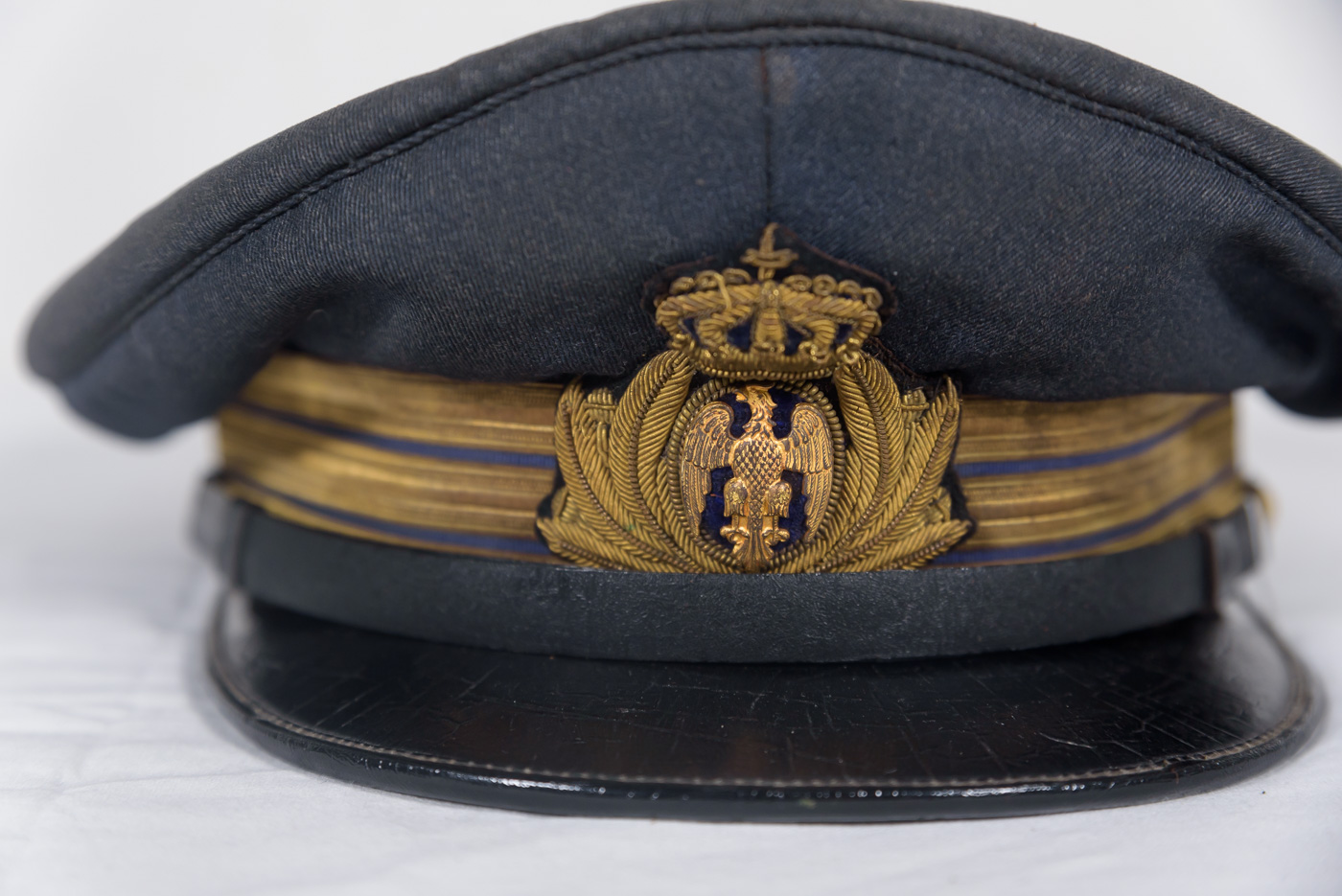 Berretto a visiera da Capitano Pilota della Regia Aeronautica della seconda Guerra Mondiale, completo dei suoi corretti attributi. Usato, buono stato di conservazione e bella patina