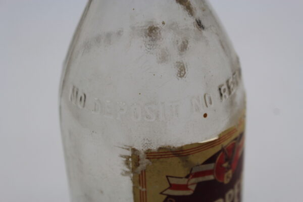 Bottiglia vuota birra “Ruppert”, fatta in vetro chiaro, fornitura US Army nella Seconda Guerra Mondiale, completa di etichetta in buono stato di conservazione. Complessivamente in buono stato di conservazione.