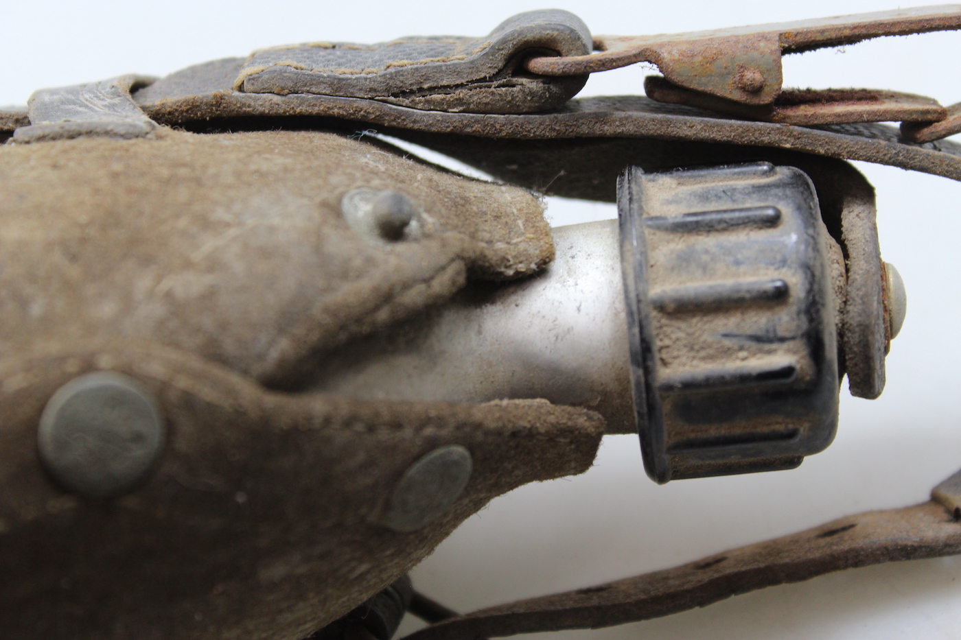 Borraccia in alluminio completa di rivestimento in feltro di lana con cinghiaggi in cuoio, mancante del gavettino, etichetta con nome del proprietario cucita su di un lato. Mai stata pulita, condizioni come da foto.
