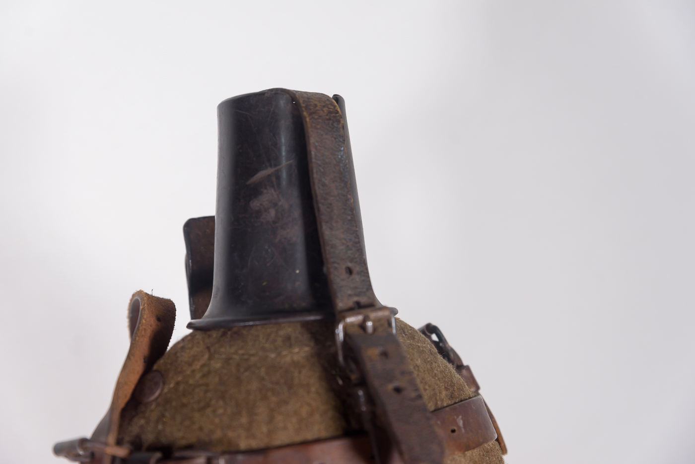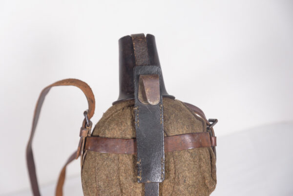 Borraccia fatta in alluminio marcata CFL-42, rivestita in feltro di lana e completa di imbracatura e cinghia tracolla in cuoio, bicchiere in bakelite. Poco usata, buono stato di conservazione.