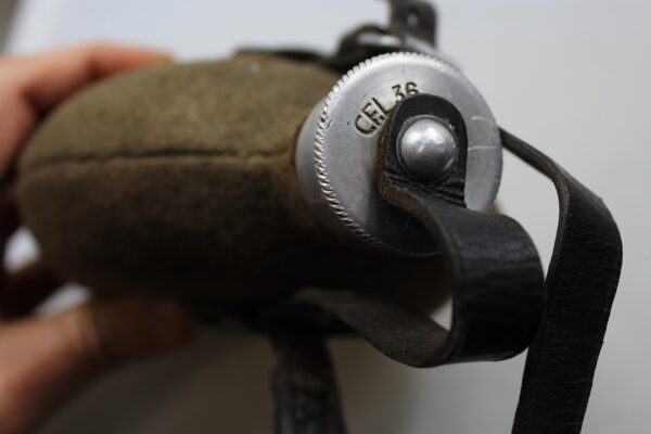 Borraccia in fatta alluminio marcata WAL-38, rivestita in feltro di lana con cinghiaggi in cuoio, completa del tappo marcato CFL-36, mancante del bicchiere. Usata, buono stato di conservazione.