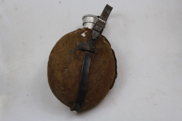 Borraccia in alluminio marcata VDNS-36, completa di rivestimento il feltro di lana con qualche problema, vedi foto in dettaglio, e cinghiaggi in cuoio, sprovvista di bicchiere. Usata, complessivamente in buono stato di conservazione.