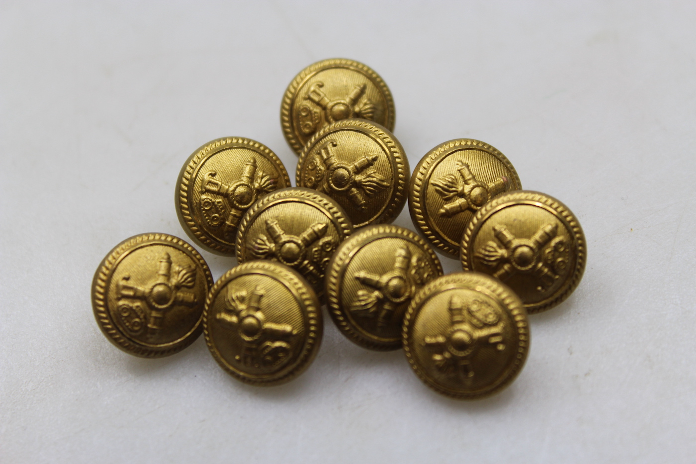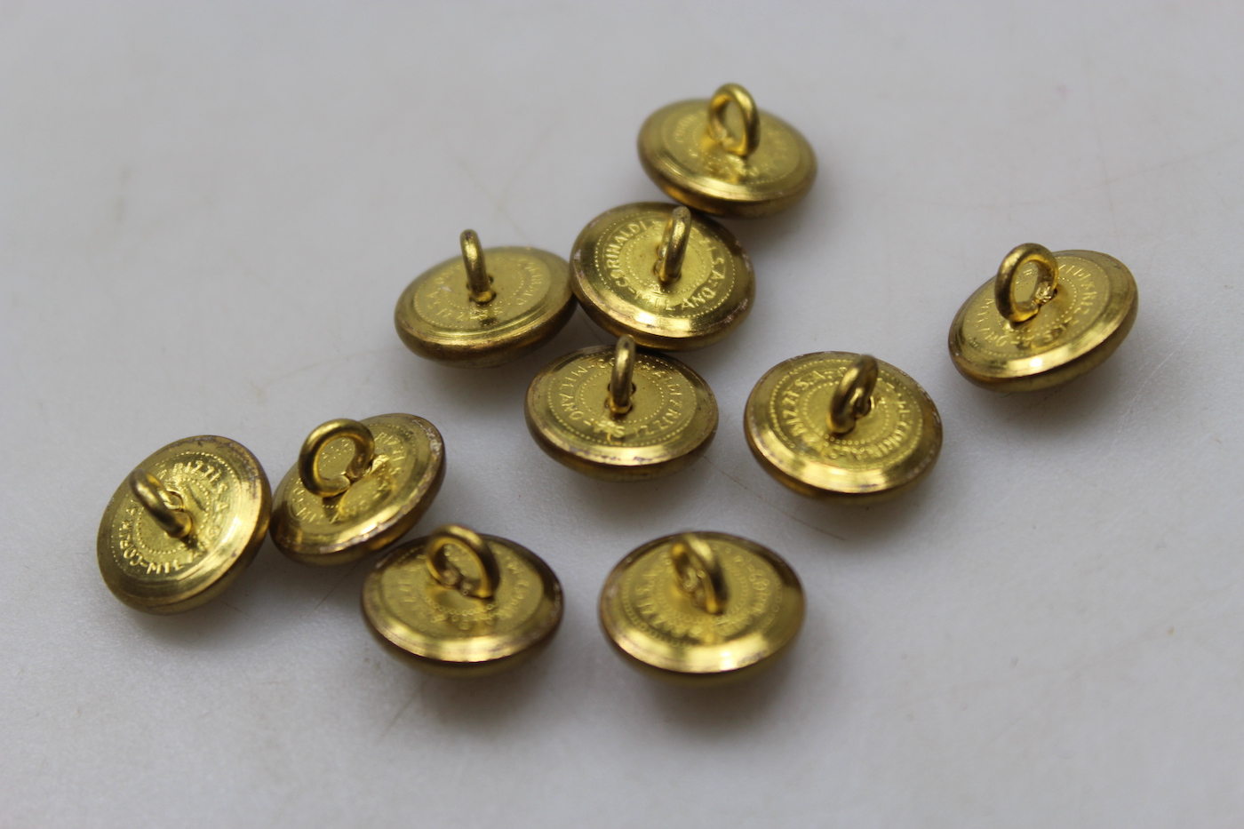 # 10 bottoni M.34 da Ufficiale Carrista del Regio Esercito Italiano della seconda Guerra Mondiale, versione piccola da 15 mm di diametro, ottimi per le tasche delle giacche M.34 e la chiusura della parte posteriore dei cappotti. Buono stato di conservazione.