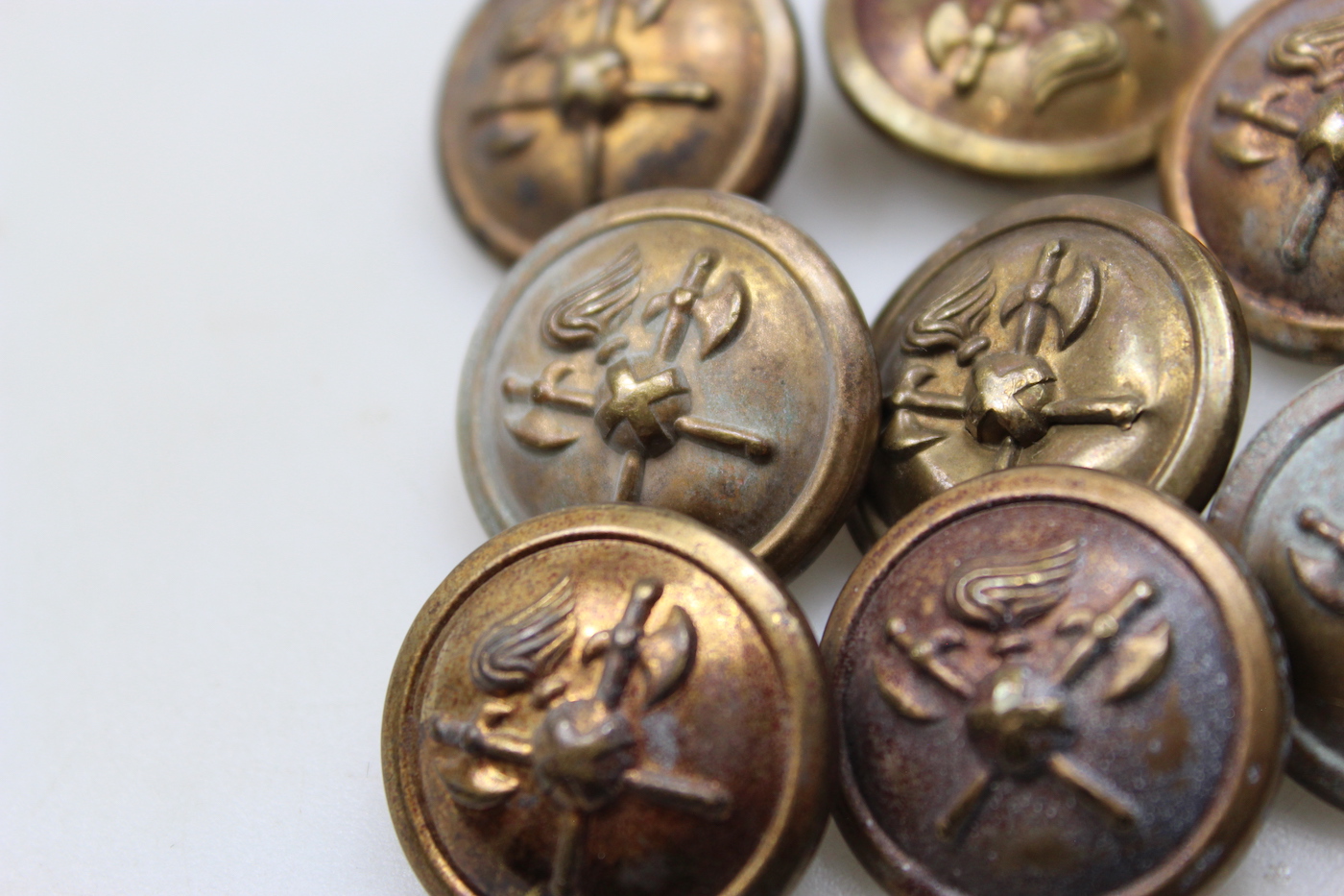 # 8 bottoni da truppa prebellici da 25 mm, ideali per cappotto truppa del Genio Pionieri del Regio Esercito Italiano anni 30′. Usati, leggermente ossidati, buono stato di conservazione.