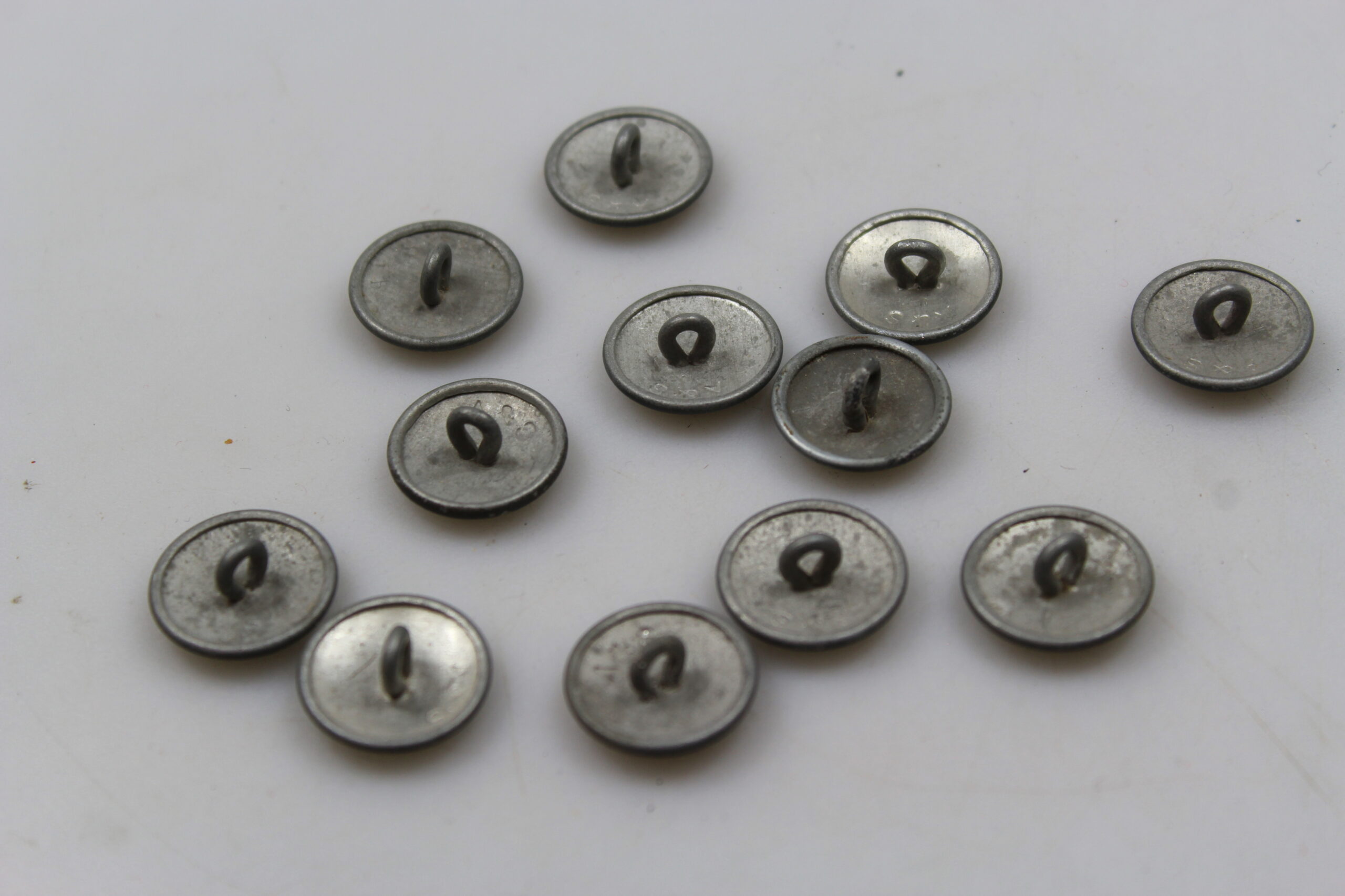 # 12 bottoni, diametro 14 mm, per giacche truppa Wehrmacht, colorazione feldgrau, praticamente “matching”, marcati con produttore. Usati, buono stato di conservazione, bella patina.