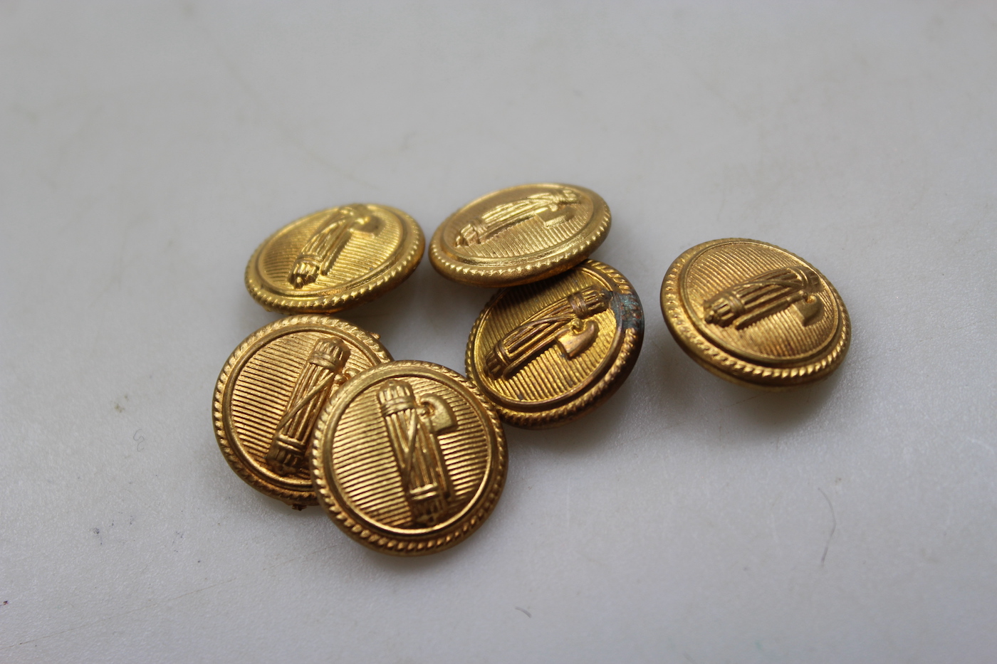 # 6 bottoni dorati per giacca, diametro 20 mm, da Ufficiale del PNF, con fascio che guarda verso destra. Poco usati, ottimo stato di conservazione.