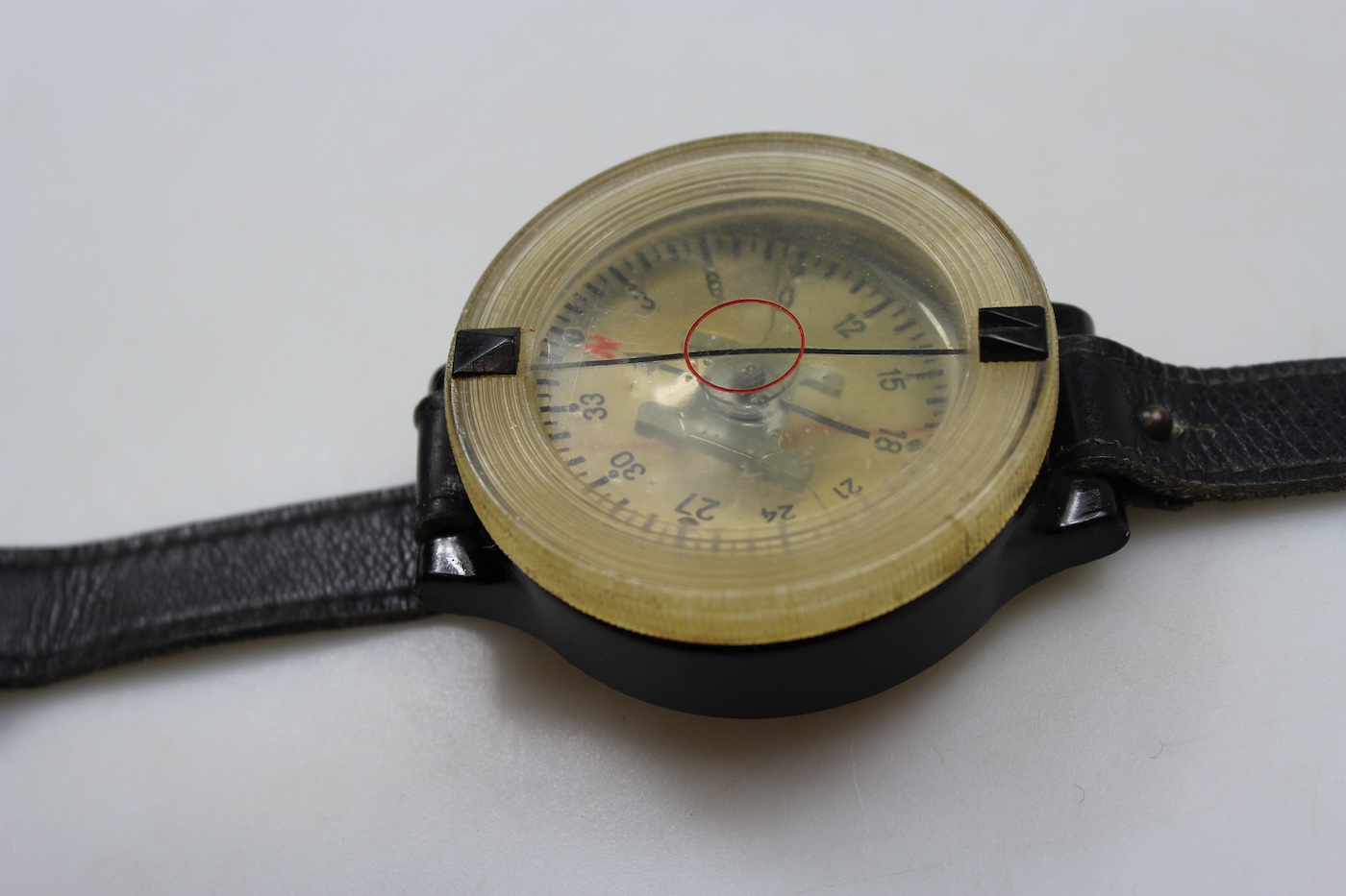 Bussola da polso a “bagno d’olio”, in dotazione ai Piloti della Luftwaffe nella Seconda Guerra Mondiale, fatta in bakelite con cinturino in pelle, marcata AK39 – FI 23235-1. Usata, perfettamente funzionante, buono stato di conservazione.