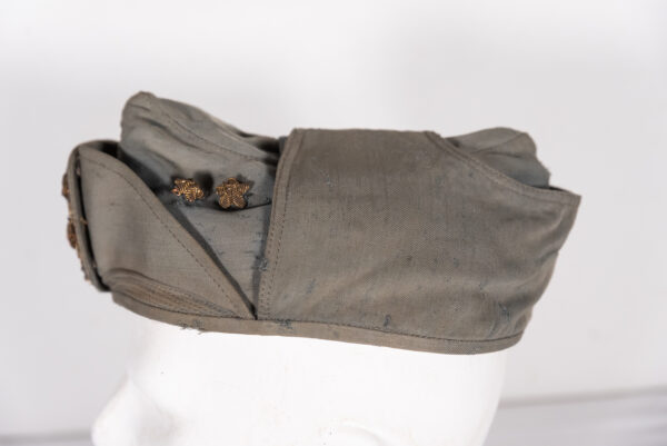 Interessante bustina M.34 da Tenente Medico di Sanità del Regio Esercito Italiano, versione estiva, fatta in tessuto con la consistenza delle camice, produttore “Ines Bosetti – Trieste” consorziato con “BERVEN”, Berrettificio Veneto. Usata, buono stato di conservazione.