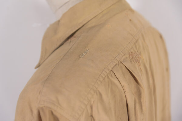 Camicia Luftwaffe tropicale/DAK, versione a manica corta aperta a tre bottoni, segni visibili dell’aquila triangolare sul petto, presente qualche vecchia riparazione d’epoca. Usata, complessivamente in buono stato di conservazione.