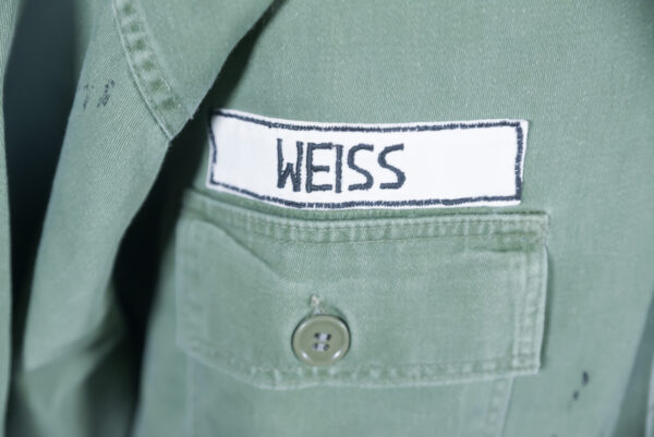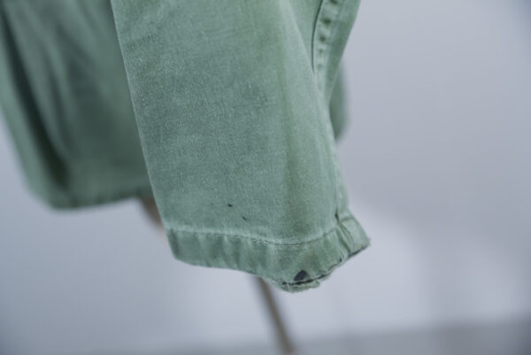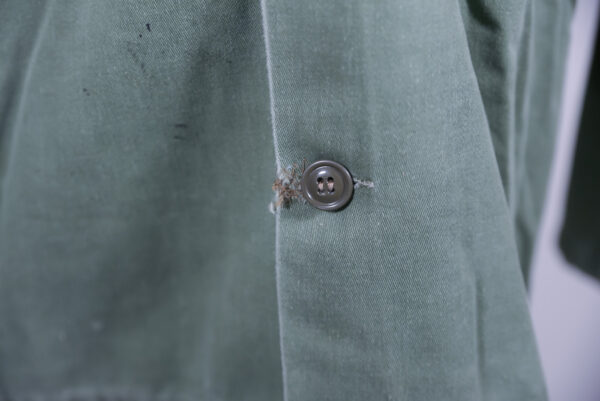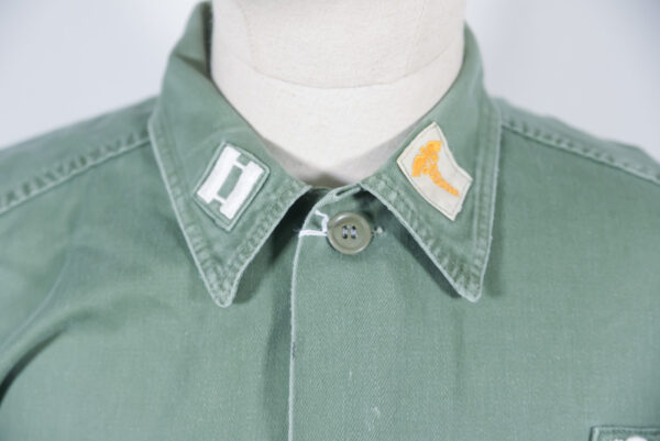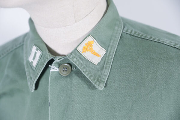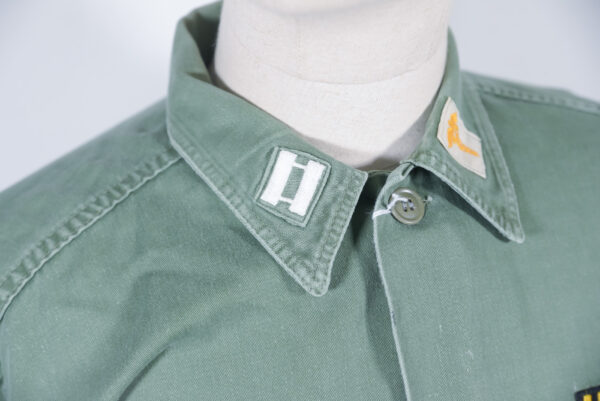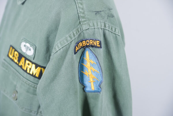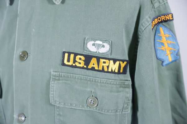 Camicia OG-107 periodo Vietnam, patch “full color” Special Forces Airborne, completa di brevetto da Paracadutista sulla tasca superiore sinistra, grado e specialità sul colletto. Pit to pit cm 58. Usata, buono stato di conservazione.