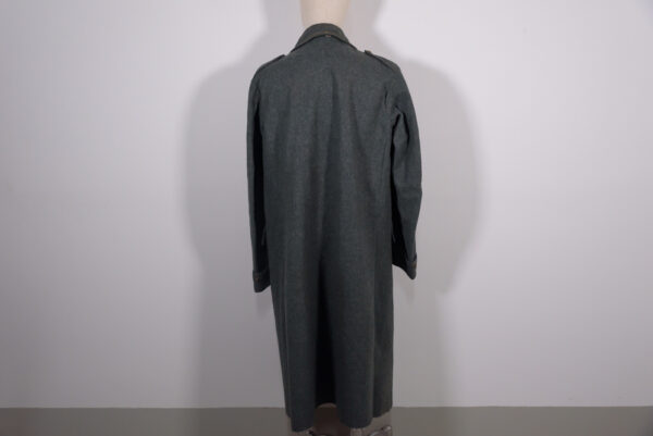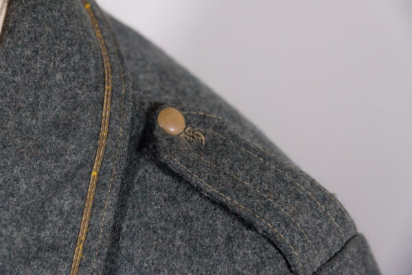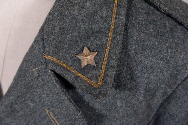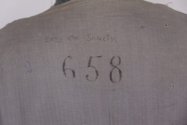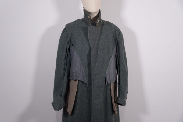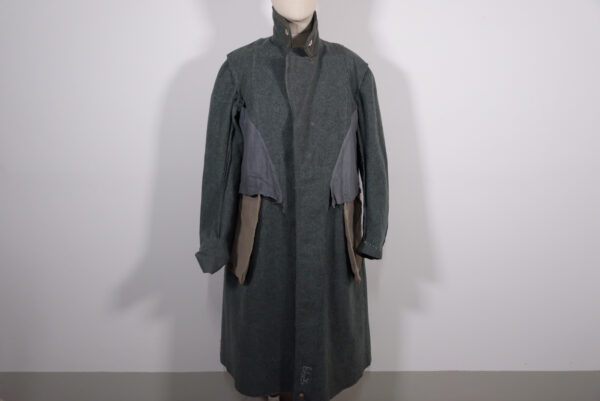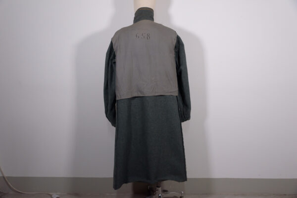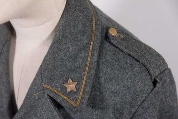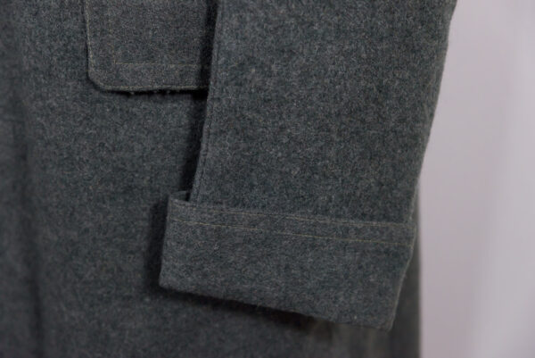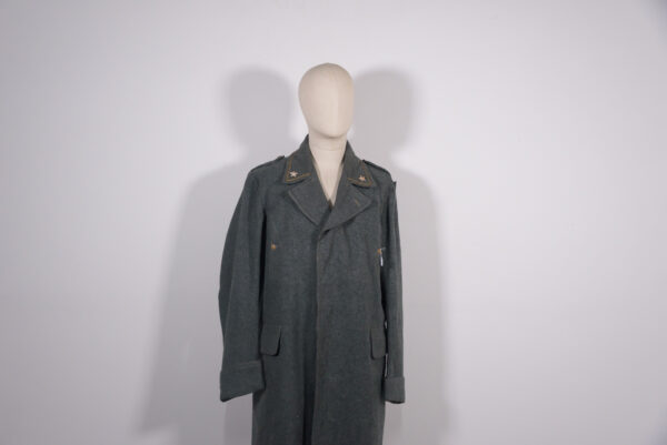 Cappotto da truppa M.40 con attributi da Aspirante Ufficiale del Regio Esercito Italiano della Seconda Guerra Mondiale, fatto in panno truppa grigio/verde, fodera interna in cotone grigio spigato, nome del proprietario. Usato, buono stato di conservazione.