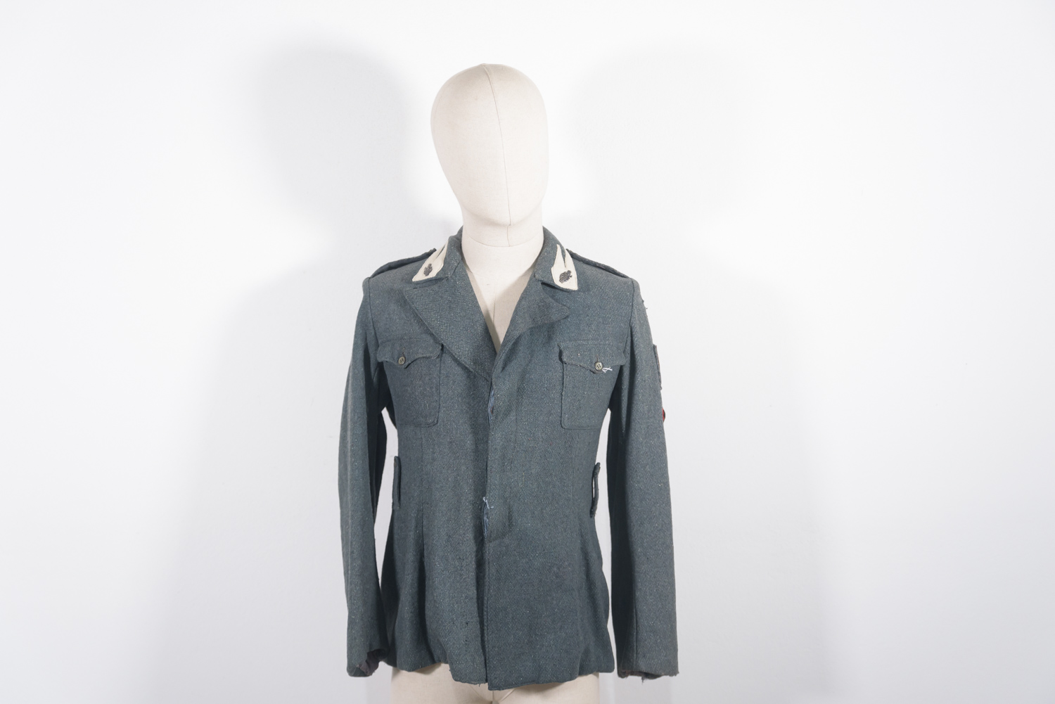 Cappotto da truppa M.40 con attributi da Aspirante Ufficiale del Regio Esercito Italiano della Seconda Guerra Mondiale, fatto in panno truppa grigio/verde, fodera interna in cotone grigio spigato, nome del proprietario. Usato, buono stato di conservazione.
