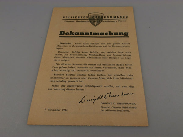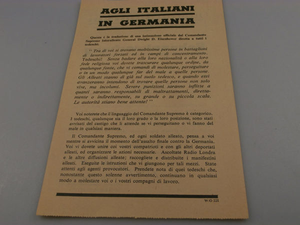Interessante volantino di propaganda anti.-nazi, lanciato durante i raid aerei degli Alleati sulle città Tedesche, in questo caso indirizzata agli Italiani, prigionieri dei Tedeschi e impiegati come “forza lavoro”. Sul retro anche un avviso alla popolazione, inviata alla resa e a fornire aiuti e protezione ai prigionieri di altre nazionalità. Buono stato di conservazione.