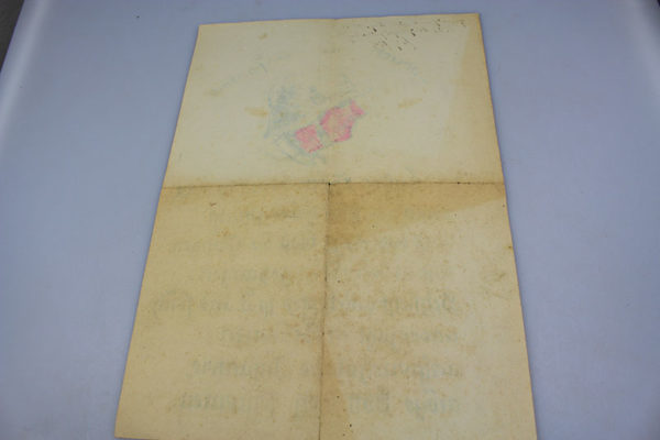 Ciclostilato d’epoca, con attestato/preghiera per la Fanteria e cartolina artigianale con ritratto, entrambi con dedica. Dimensioni cm 30×20. Buono stato di conservazione.