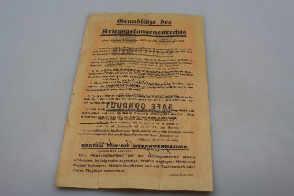 “Safe conduct”. Volantino di propaganda/salvacondotto bilingue,”sparato” con apposite granate, dagli Alleati verso le linee Tedesche attestate sul versante emiliano della Linea Gotica durante l’inverno del 1944. In questo volantino si pongono le condizioni della resa con i benefici a cui andrà incontro chi si arrenderà. Buono stato di conservazione.