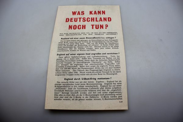 ” Was kann Deutschland noch tun ?” – Cos’altro può fare la Germania ?.Interessante volantino di propaganda anti-nazi, dove si informa il popolo Tedesco del disastroso andamento della guerra per la Germania, lanciato durante i raid aerei degli Alleati sulle città Tedesche. Buono stato di conservazione.