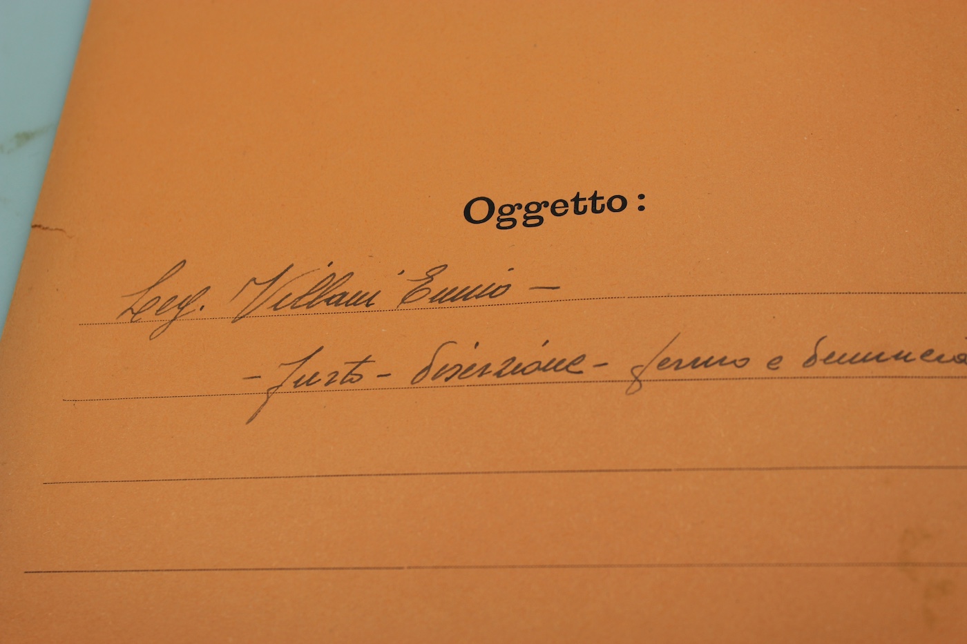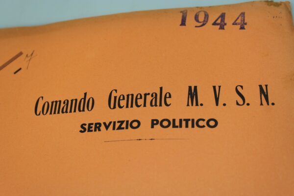 Cartella da ufficio per documentazione ( cm 32×23 ), intestata al Comando Generale MVSN, Milizia Volontaria Sicurezza Nazionale, Servizio Politico – 1944. Usata, buono stato di conservazione.
