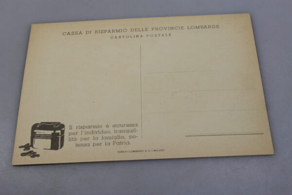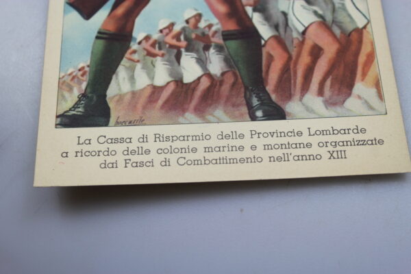 Cartolina postale di Gino Boccasile per la Cassa di Risparmio delle province Lombarde, “a ricordo delle colonie marine e montane, organizzate dai Fasci di Combattimento nell’anno XIII° EF “. Non usata, perfetto stato di conservazione.