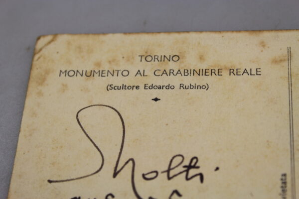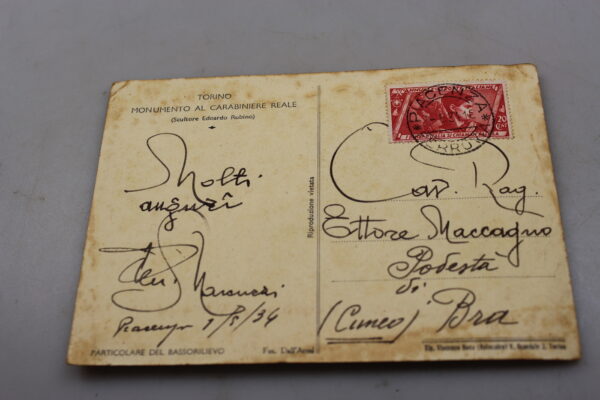Cartolina postale “Monumento al Carabiniere Reale” Torino, indirizzata nel 1934 al Cav,Rag. Ettore Maccagno, Posestà di Bra (CN). Usata, buono stato di conservazione.