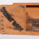 Cassa in legno specifica per lo stoccaggio e il trasporto delle Tellermine 42. Marcata, usata, buono stato di conservazione.