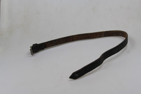 Cinghia in cuoio, speciofica per gavetta Wehrmacht della Seconda Guerra Mondiale, lunghezza cm 52, buchi di regolamentazione concentrati sul terminale del lato opposto alla fibbia. Usata, marcata con produttore e data, buono stato di conservazione.
