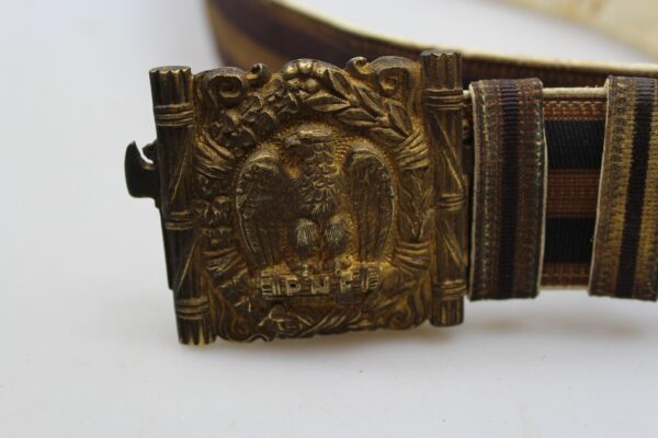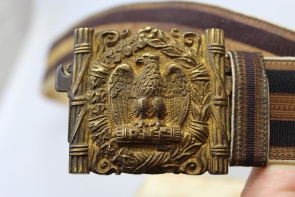 Cinturone da parata fatto in broccato con fibbia rettangolare da Gerarca del Partito Nazionale Fascista. Usata, buono stato di conservazione e bella patina.