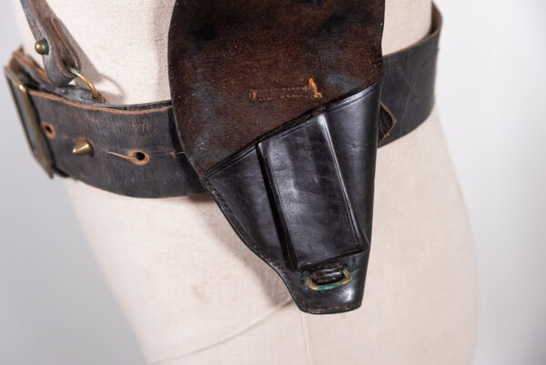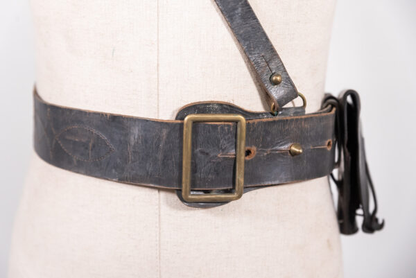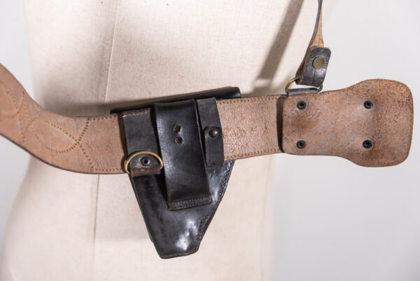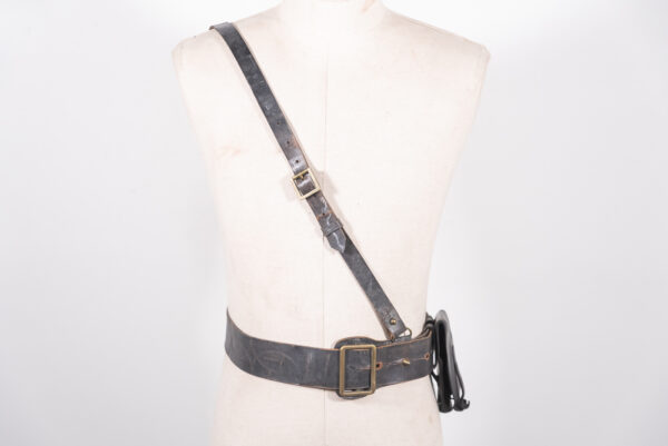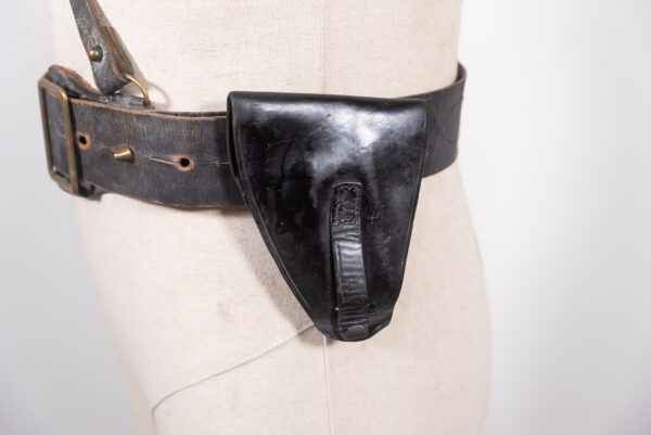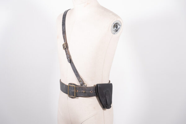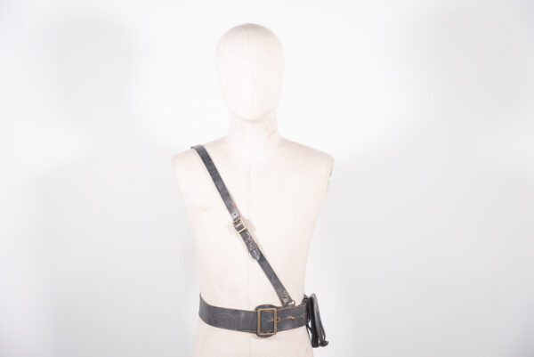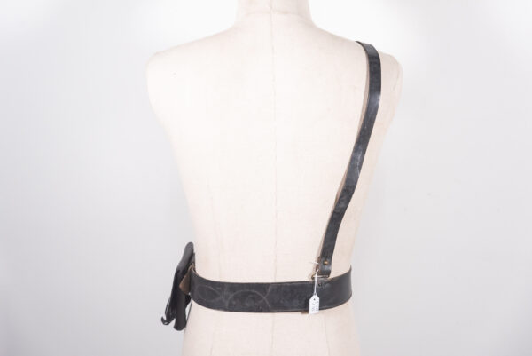 Cinturone “Sam Browne” fatto in cuoio nero, completo di spallaccio e fondina per pistola Beretta 6.35. Usato, buono stato di conservazione.